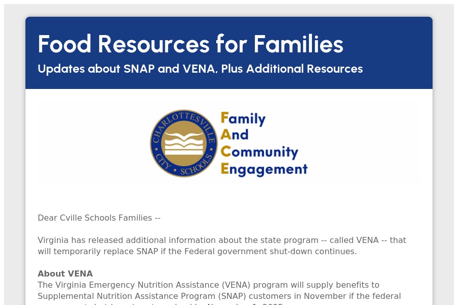 Food Resources for Families Updates about SNAP and VENA, Plus Additional Resources Dear Cville Schools Families -- Virginia has released additional information about . . .